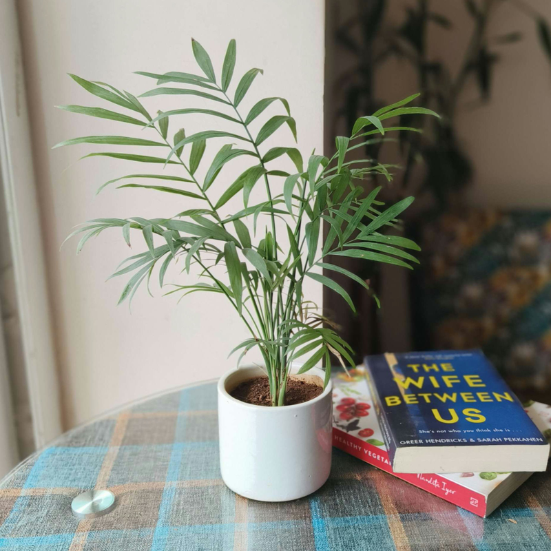 Plant: Table Palm/Chamaedorea PalmLocation: Bright Indirect Light/IndoorWater: Twice a weekPot: White Ceramic Pot Size: 3.5×4 inchHeight with plant: 9 inch